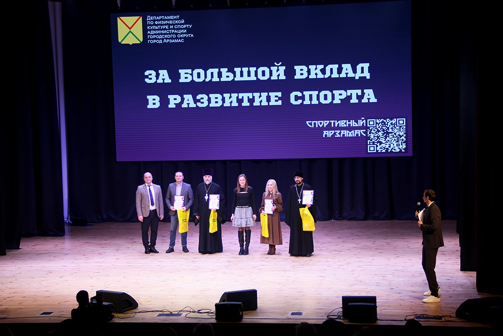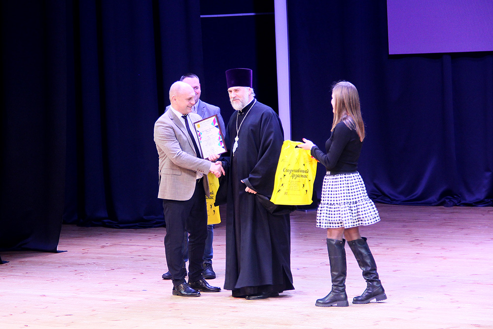 На мероприятии чествовали арзамасских спортсменов, тренеров, всех, кто не равнодушен к физкультуре и спорту. В том числе, Благодарственное письмо за большой вклад в развитие спорта было вручено помощнику по физической культуре и спорту благочинного округа Арзамасского района протоиерею Олегу Куря.