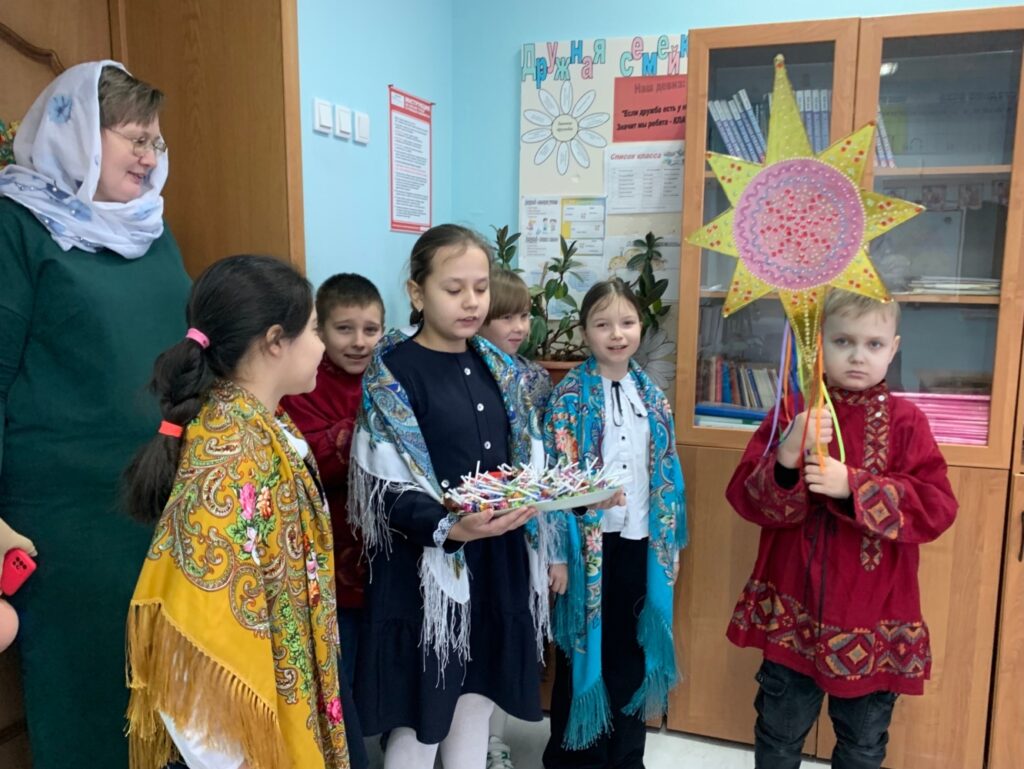 Ученики воскресной школы радостно с угощениями заходили во все классы, исполняли Рождественские праздничные колядки, читали стихи, посвященные Рождеству Христову, дарили детям и учителям добрые пожелания мира, счастья и любви.