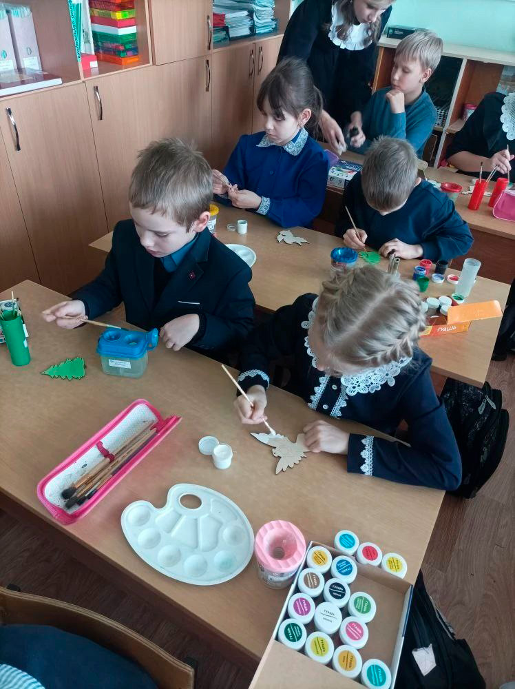 После торжественной части второклассники отправились на мастер-класс по росписи рождественских ангелов и елочных украшений, который для них подготовили и провели ученики 9 класса.