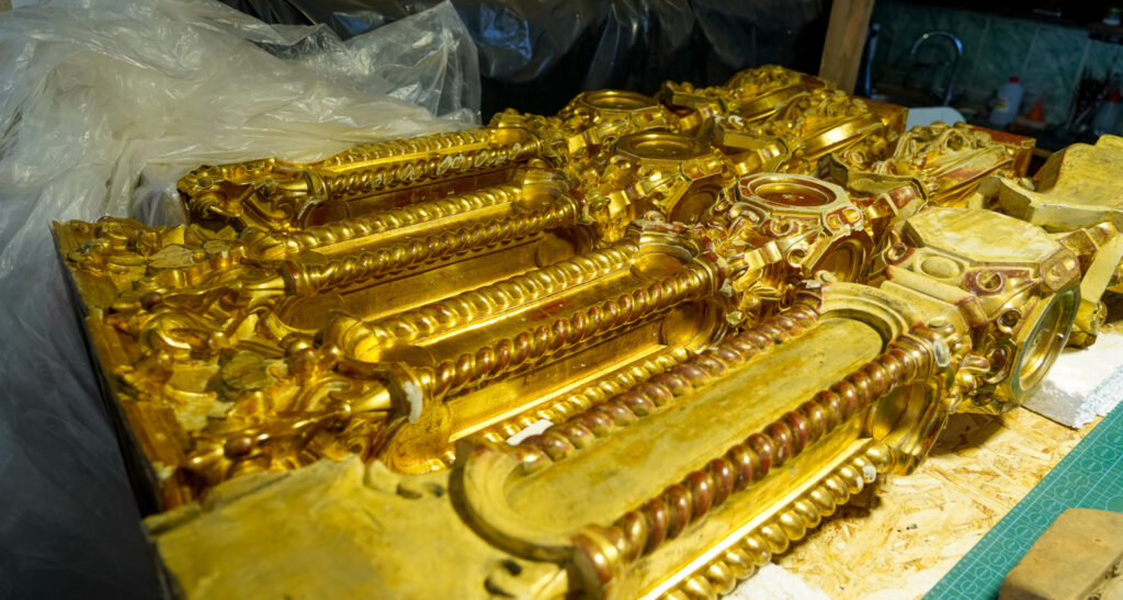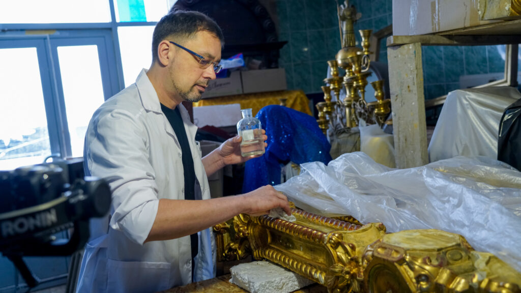 В летнем и зимнем храмах продолжается работа над внутренним убранством. Так, в южном приделе зимнего храма продолжается расчистка лицевой и тыльной сторон иконостаса, идет укрепление левкаса тела и золоченой резьбы. Будут выполнены укрепление конструкции иконостаса и инсектицидная обработка. Далее специалисты приступят к восполнению утрат.