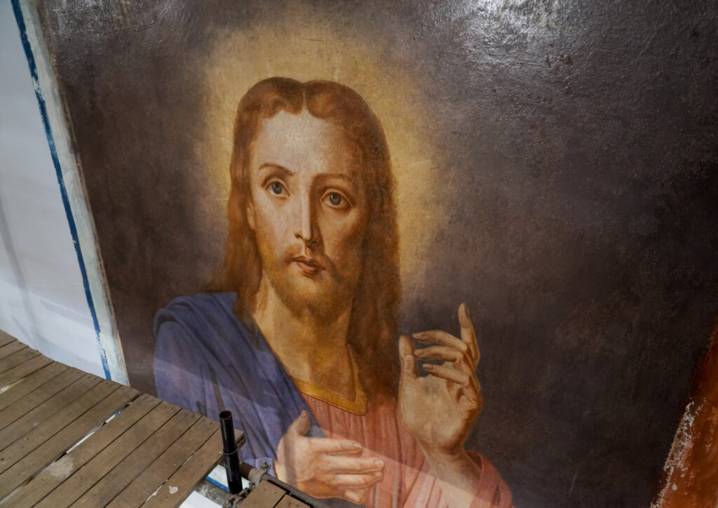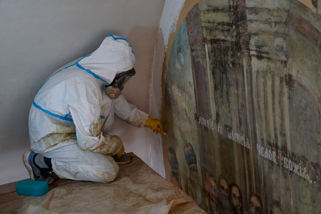 Уже закончена работа над композициями в алтарной части и основная композиция на западной стене центрального объема. Ведутся расчистки живописи северного придела и центральной части храма.