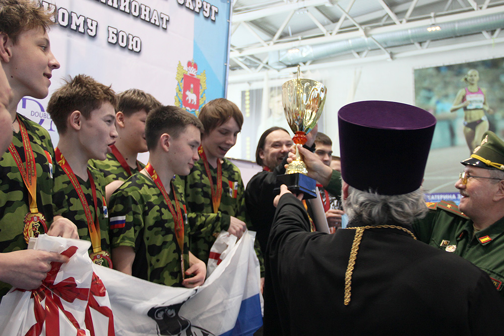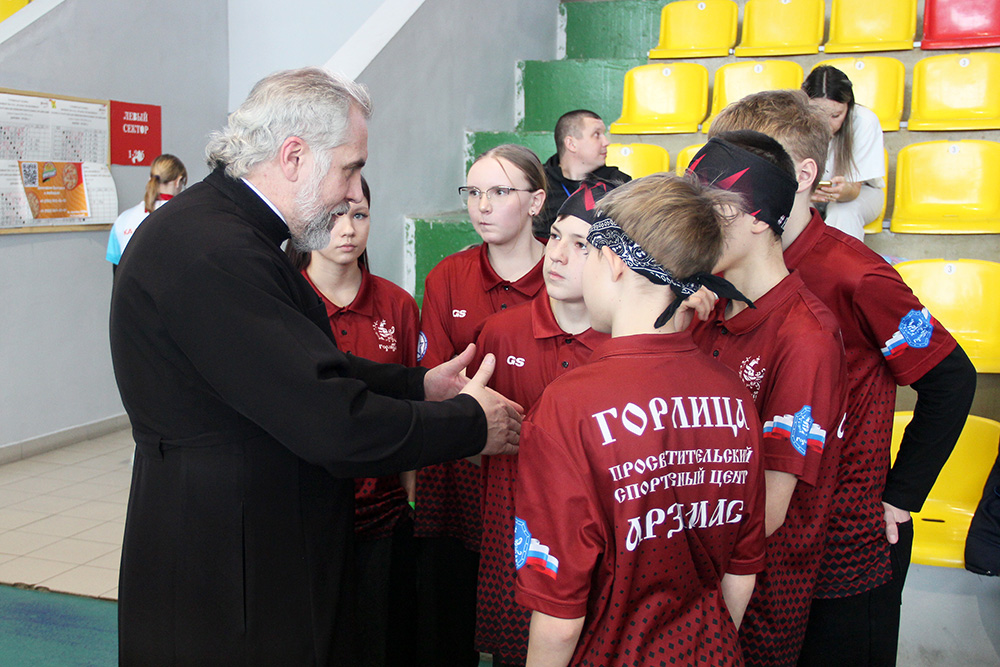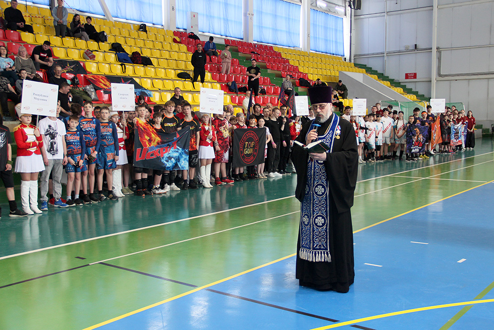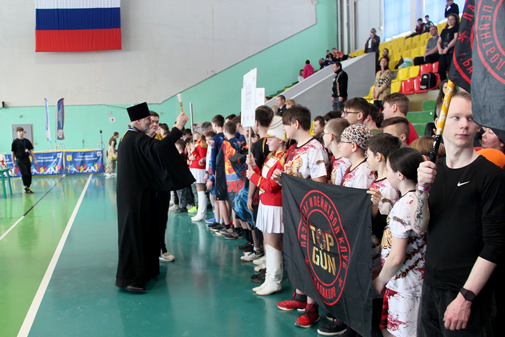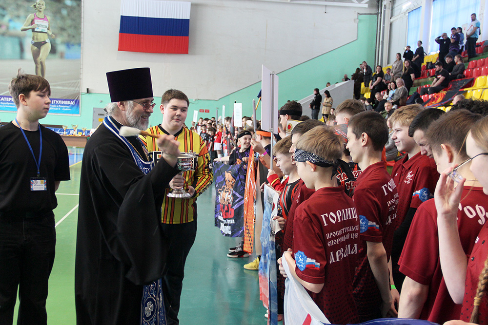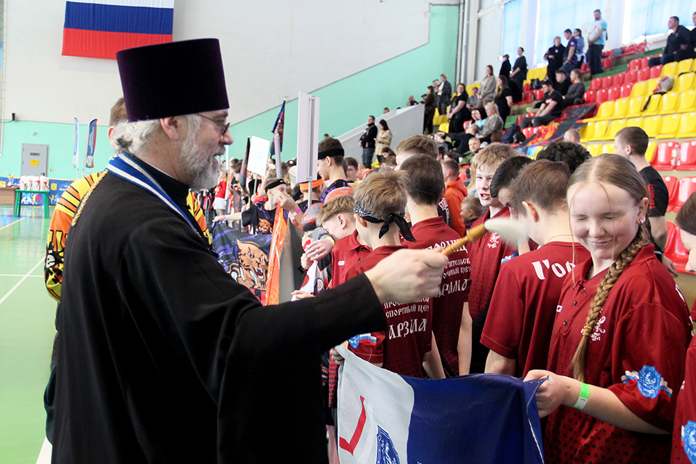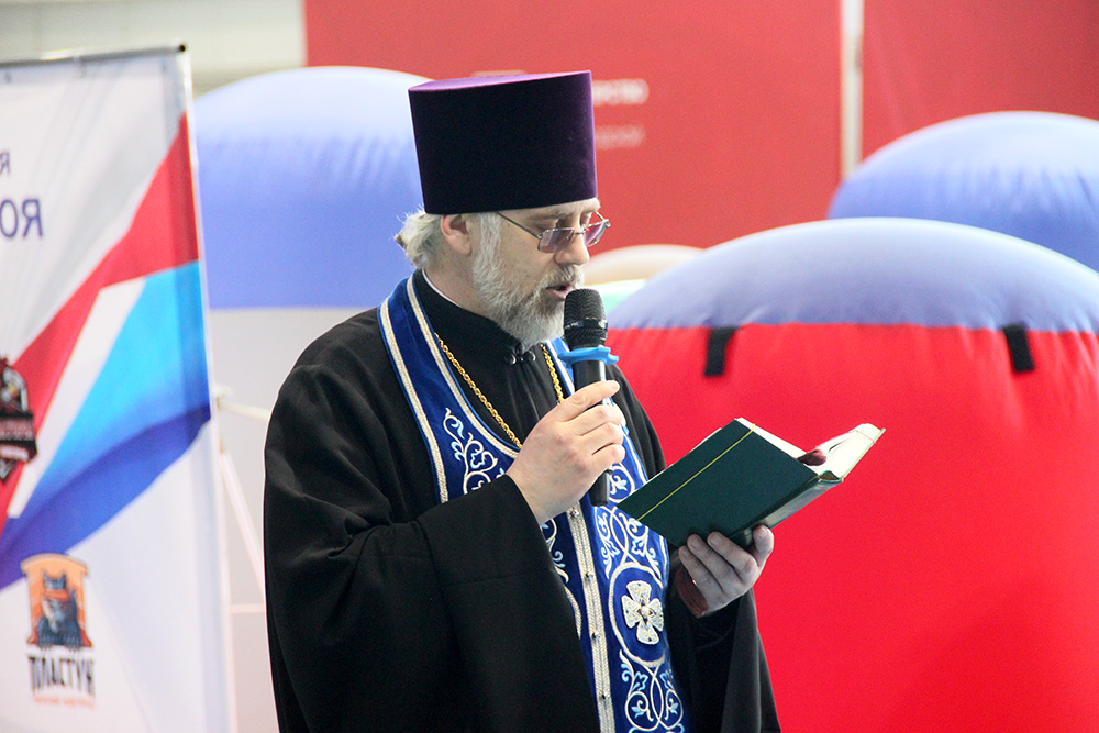 После приветствия, был совершен краткий молебен на начало всякого благого дела, и отец Олег окропил участников состязаний святой водой.